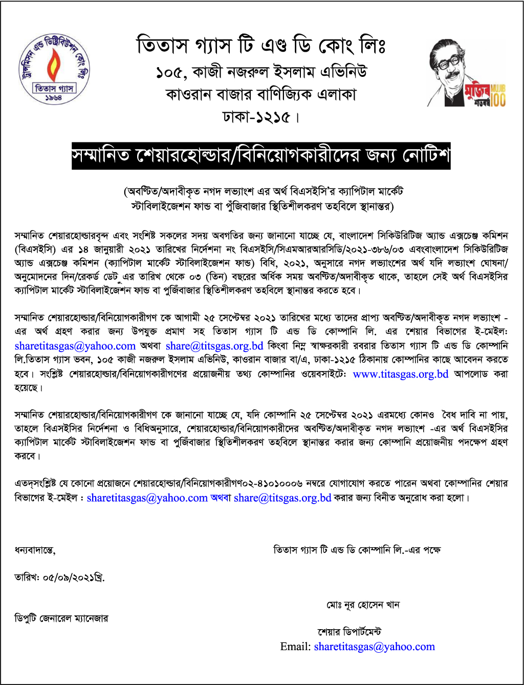 অবণ্টিত/অদাবীকৃত নগদ লভ্যাংশ এর অর্থ বিএসইসি’র ক্যাপিটাল মার্কেট স্টাবিলাইজেশন ফান্ড বা পুঁজিবাজার স্থিতিশীল করণ তহবিলে স্থানান্তর Monday, 6th September 2021, 3:34 pm Post Views: ২,২৯০