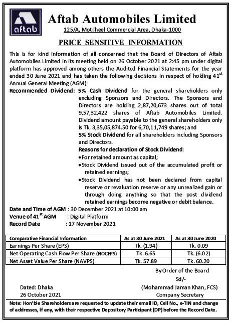 AFTAB AUTOMOBILES LTD. – PRICE SENSITIVE INFORMATION Tuesday, 26th October 2021, 8:17 pm Post Views: ২,৫২৮