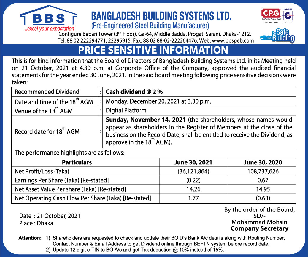 BANGLADESH BUILDING SYSTEMS LTD.- PRICE SENSITIVE INFORMATION