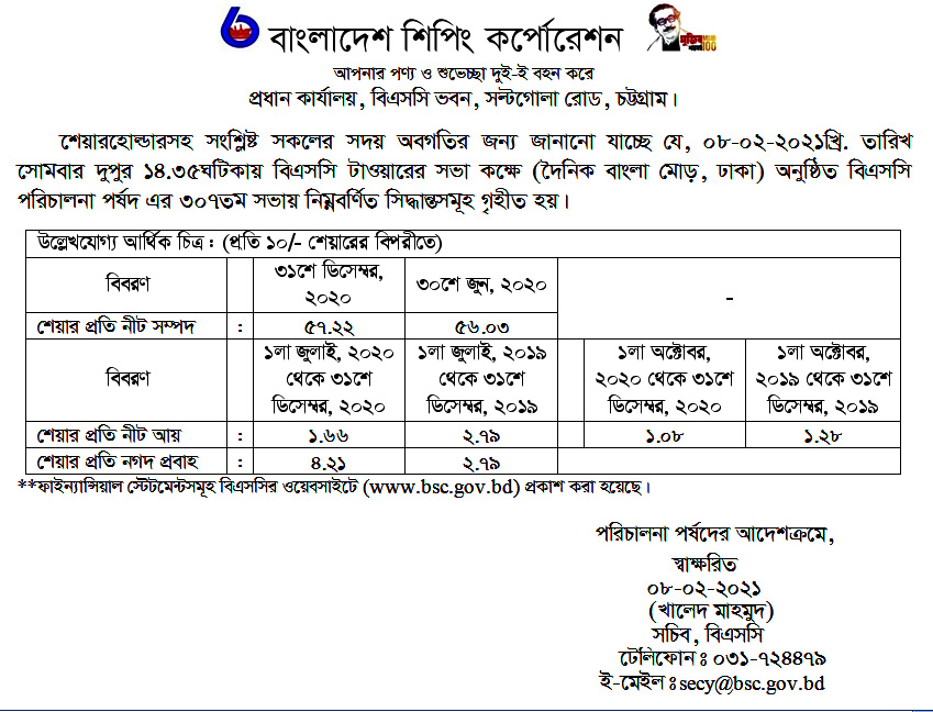 Bangladesh Shipping Corporation – PRICE SENSITIVE INFORMATION Monday, 8th February 2021, 4:48 pm Post Views: ৯৮৫