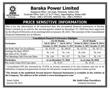 Baraka Power Ltd.- Price Sensitive Information Thursday, 28th January 2021, 8:17 pm Post Views: ২,০৫৮
