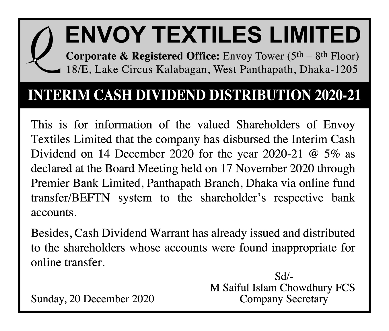 ENVOY TEXTILES LTD. INTERIM CASH DIVIDEND DISTRIBUTION 2020-21 SM Zahid 5 years ago ENVOY TEXTILES LTD. INTERIM CASH DIVIDEND DISTRIBUTION 2020-21