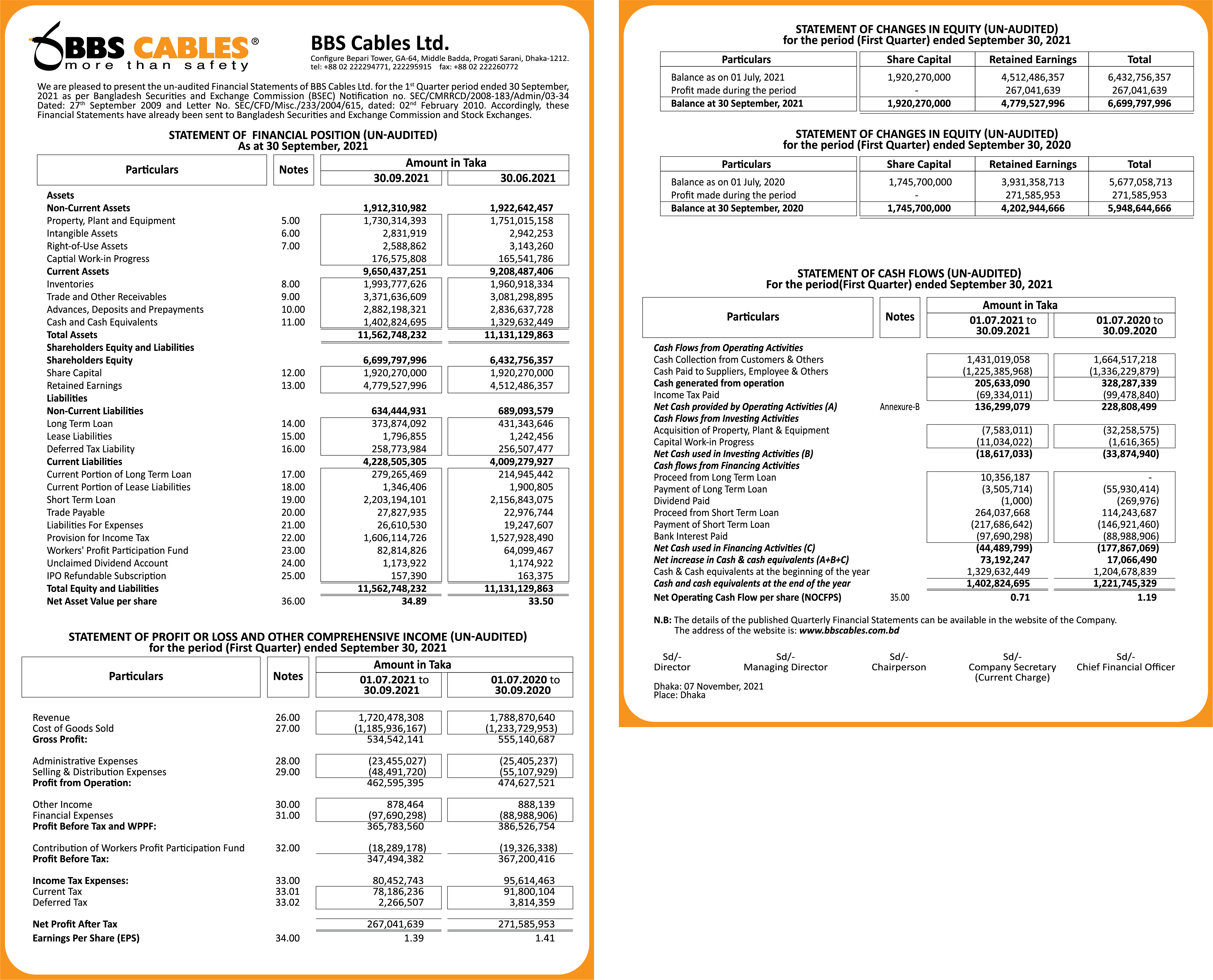 First Quarter Un-Audited Financial Statement of BBS Cables Ltd. Sunday, 7th November 2021, 8:34 pm Post Views: ২,৭৭৫