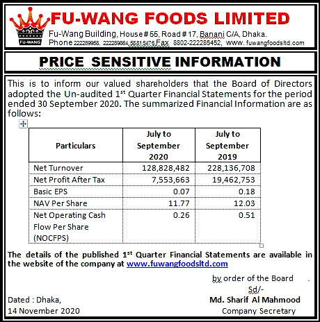 FU-WANG FOODS LIMITED – PRICE SENSITIVE INFORMATION Sunday, 15th November 2020, 1:34 am FU-WANG FOODS LIMITED – PRICE SENSITIVE INFORMATION Post Views: ২,১৪৯
