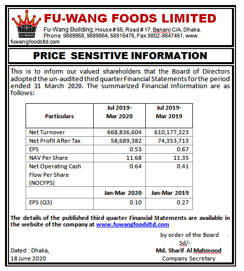 FU-WANG FOODS LIMITED-PRICE SENSITIVE INFORMATION Thursday, 18th June 2020, 7:01 pm FU-WANG FOODS LIMITED-PRICE SENSITIVE Post Views: ৪,৬১৮