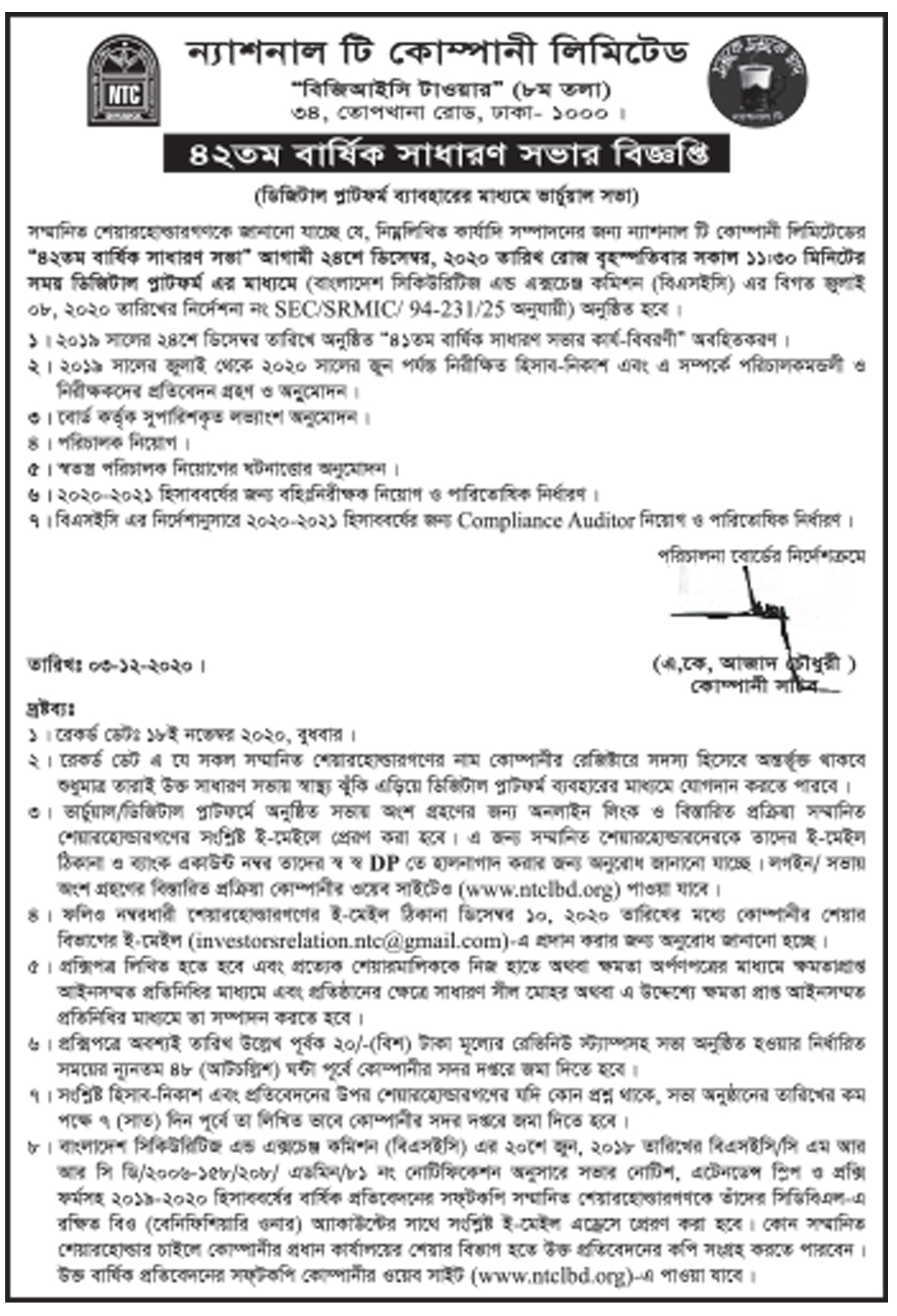 National Tea Company Ltd.- AGM Notice Sunday, 6th December 2020, 3:30 pm National Tea Company Ltd.- AGM Notice Post Views: ২,৭১১