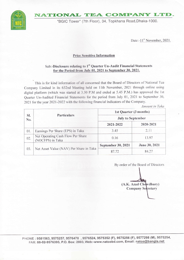National Tea Company Ltd. – Price Sensitive Information 1st Quater Un-Audit Financial Statements Thursday, 11th November 2021, 7:49 pm Post Views: ১,৮০০