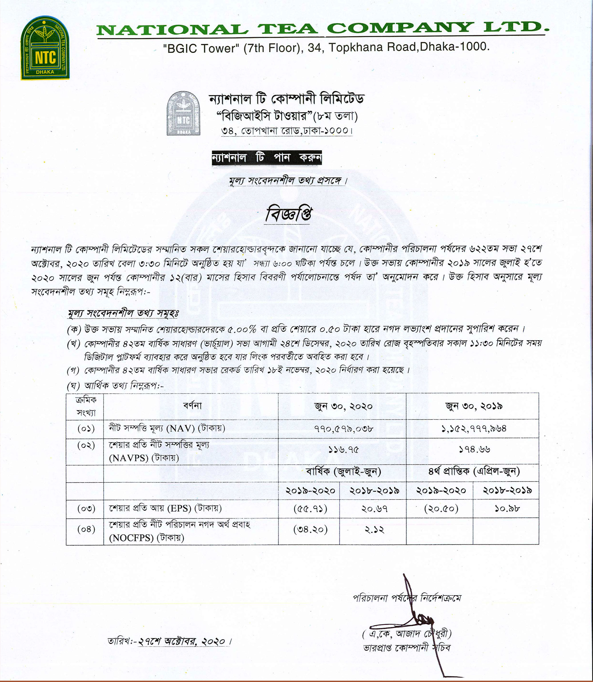 National Tea Company Ltd.-PRICE SENSITIVE INFORMATION SM Zahid 6 years ago National Tea Company Ltd.-PRICE SENSITIVE INFORMATION