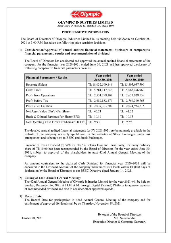 OLYMPIC INDUSTRIES LTD- PRICE SENSITIVE INFORMATION Thursday, 28th October 2021, 4:23 pm Post Views: ১,৮০২