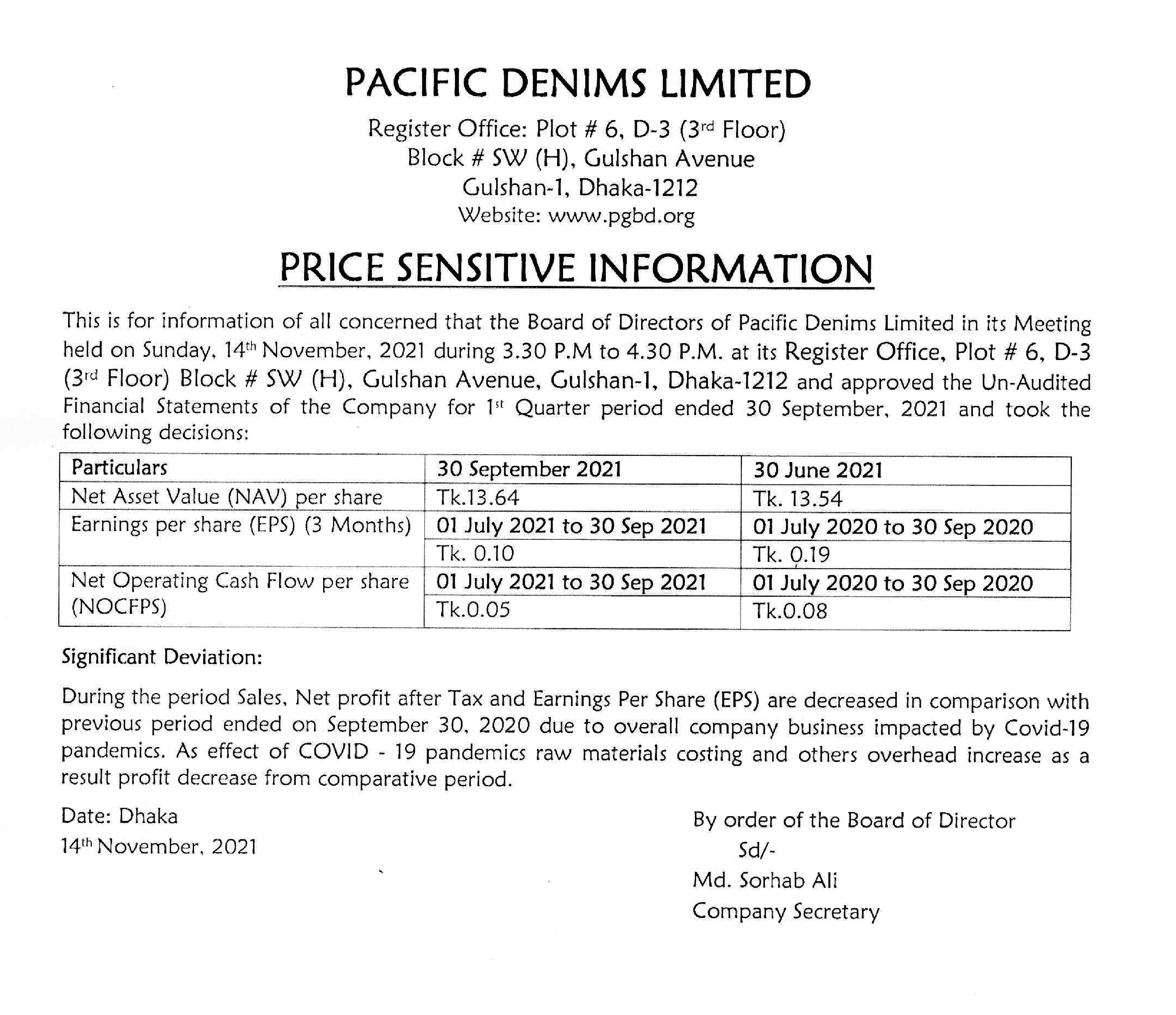 PACIFIC DENIMS LIMITED- PRICE SENSITIVE INFORMATION Sunday, 14th November 2021, 5:02 pm Post Views: ১,৯২১