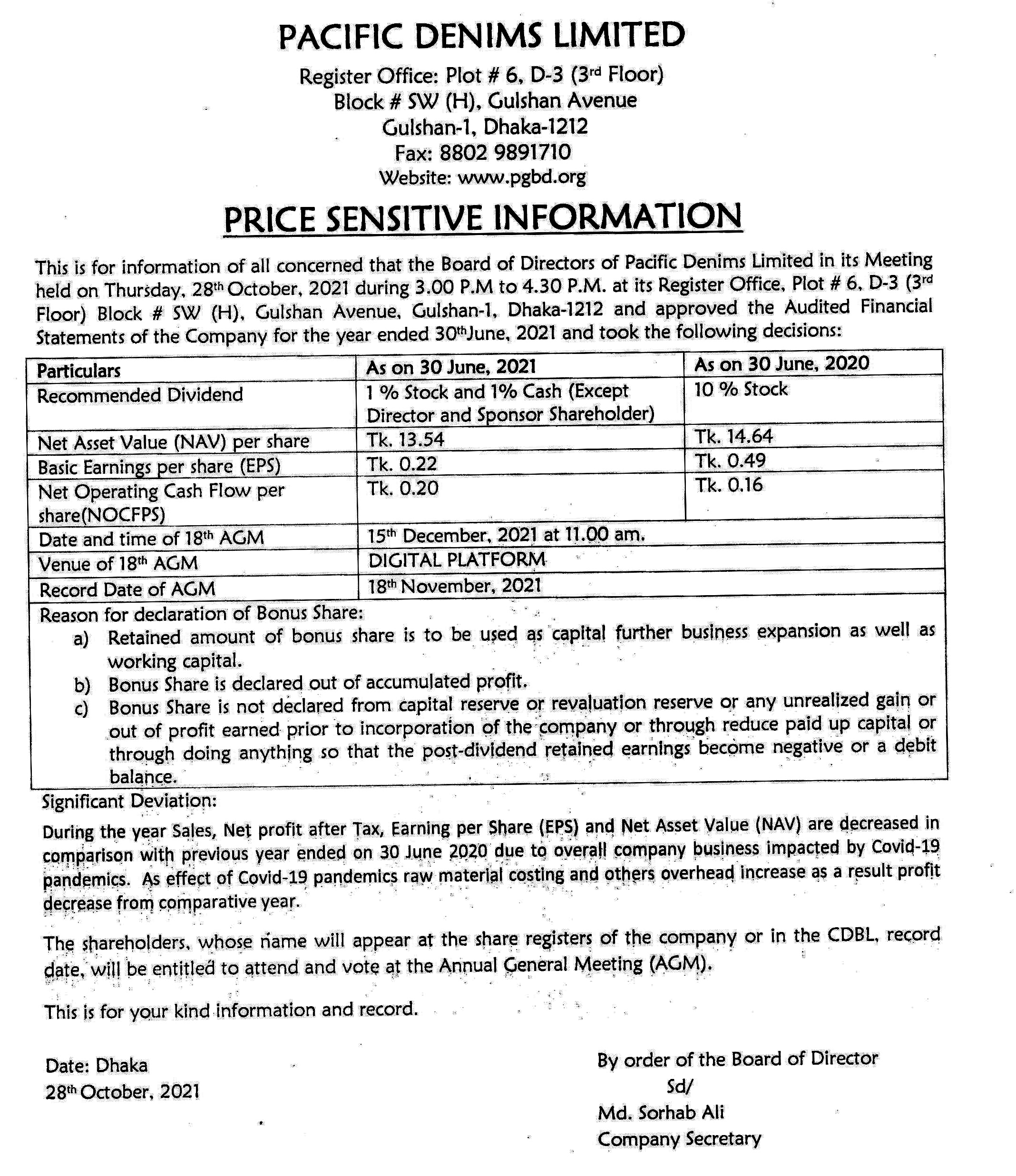 PACIFIC DENIMS LIMITED- PRICE SENSITIVE INFORMATION Thursday, 28th October 2021, 5:02 pm Post Views: ১,৯৯৭