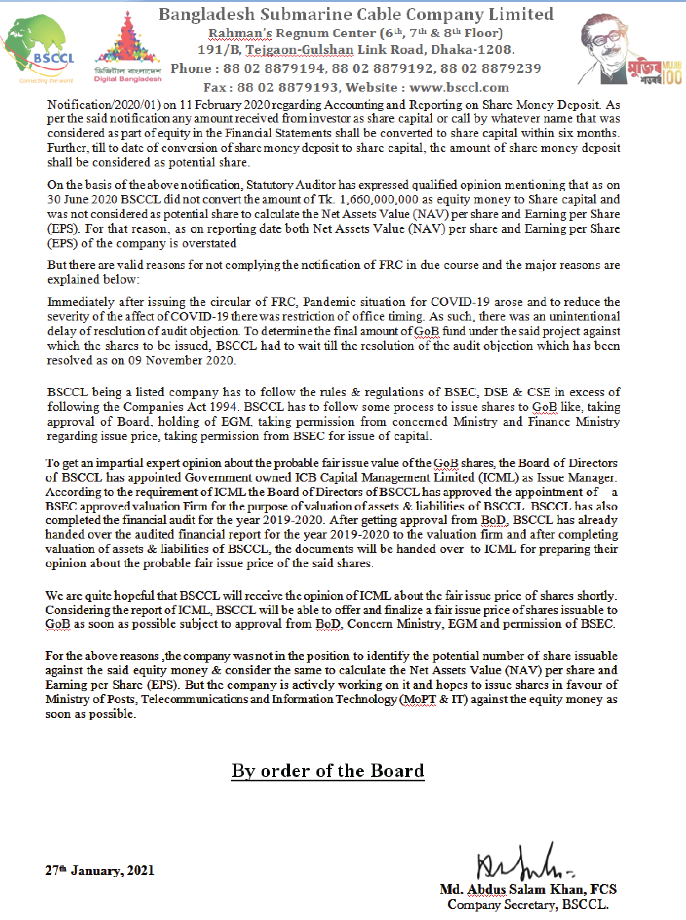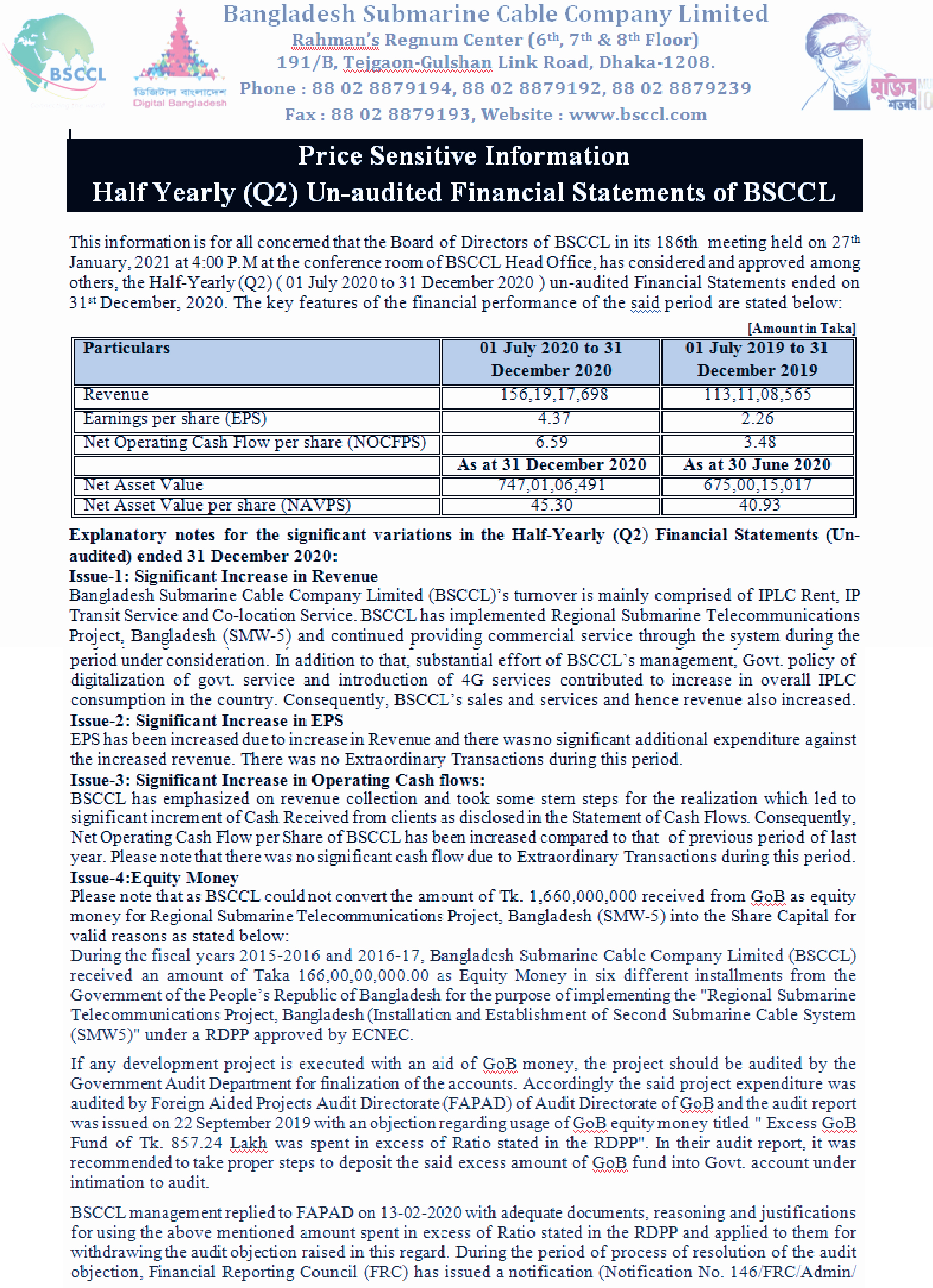 Price Sensitive Information Half Yearly (Q2) Un-audited Financial Statements of BSCCL Wednesday, 27th January 2021, 9:26 pm Price Sensitive Information Half Yearly (Q2) Un-audited Financial Statements of BSCCL Post Views: ২,১৭৩