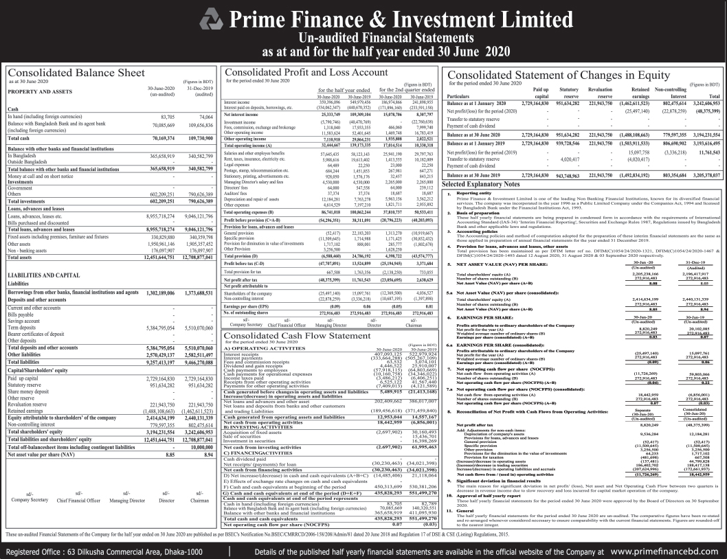 Prime Finance & Investment Ltd- Half year un-audited Financial Statement, 30 June 2020 Monday, 5th October 2020, 12:03 pm Prime Finance & Investment Ltd- Half year un-audited Financial Statement, 30 June 2020 Post Views: ১,৯২৯