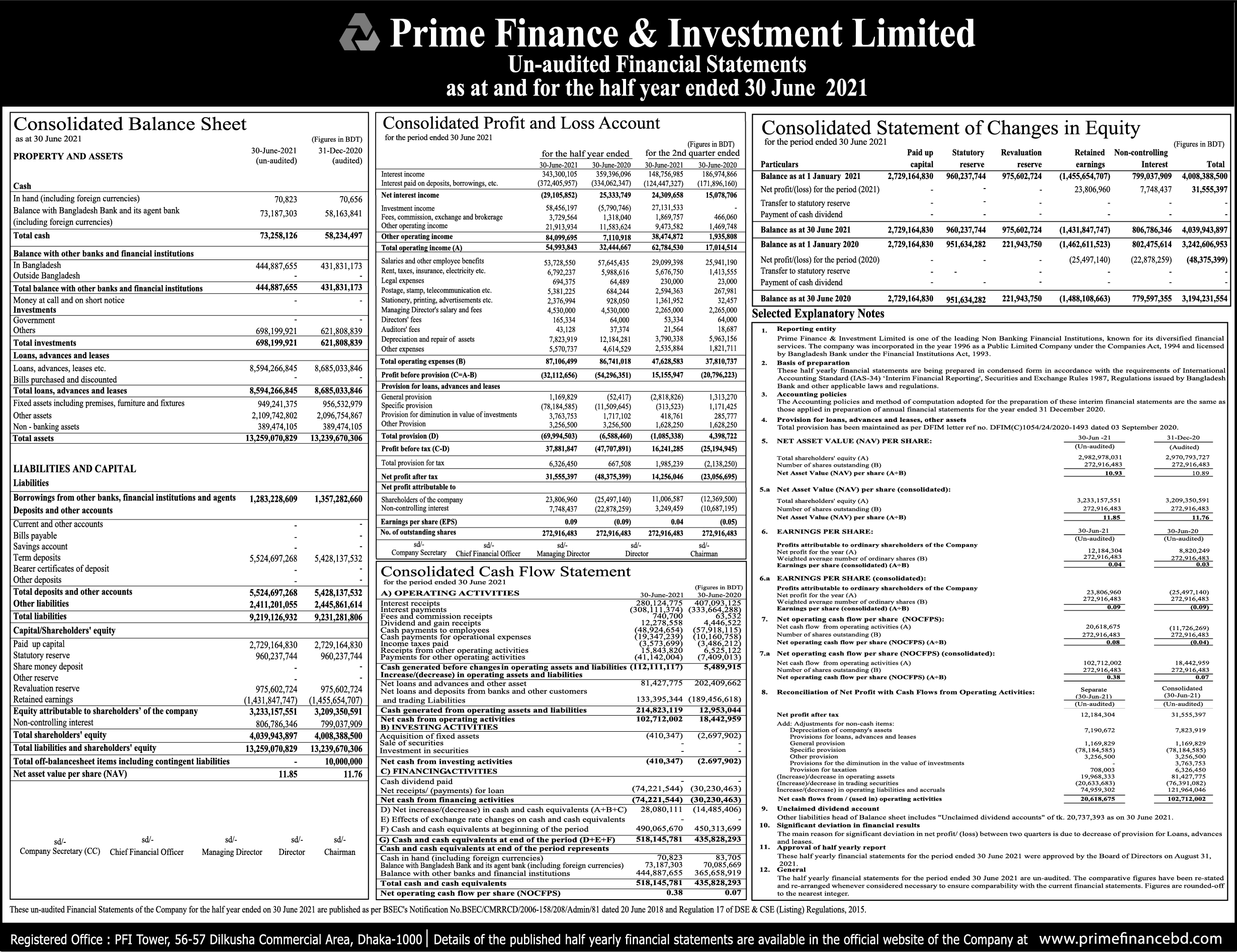 Prime Finance & Investment Ltd- Half year un-audited Financial Statement, 30 June 2021 Saturday, 4th September 2021, 10:02 am Post Views: ১,৬৬৭