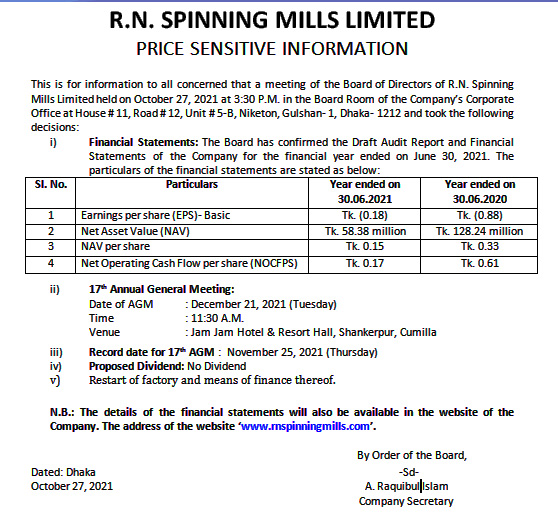 R.N. SPINNING MILLS LTD- PRICE SENSITIVE INFORMATION Wednesday, 27th October 2021, 7:08 pm Post Views: ১,৮১১