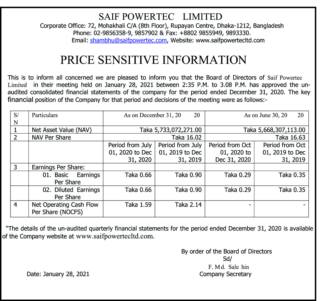 Saif Powertec Limited – Price Sensitive Information Thursday, 28th January 2021, 7:40 pm Saif Powertec Limited – Price Sensitive Information Post Views: ৯৬৭