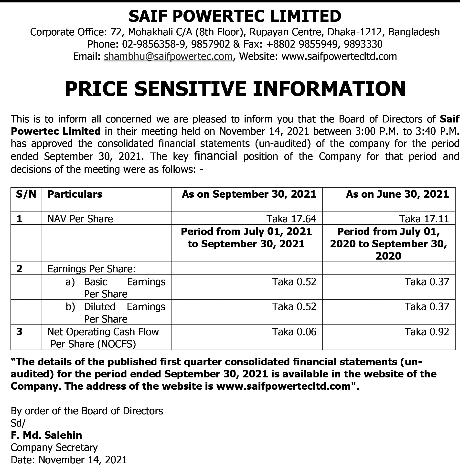 Saif Powertec Ltd- Price Sensitive Information