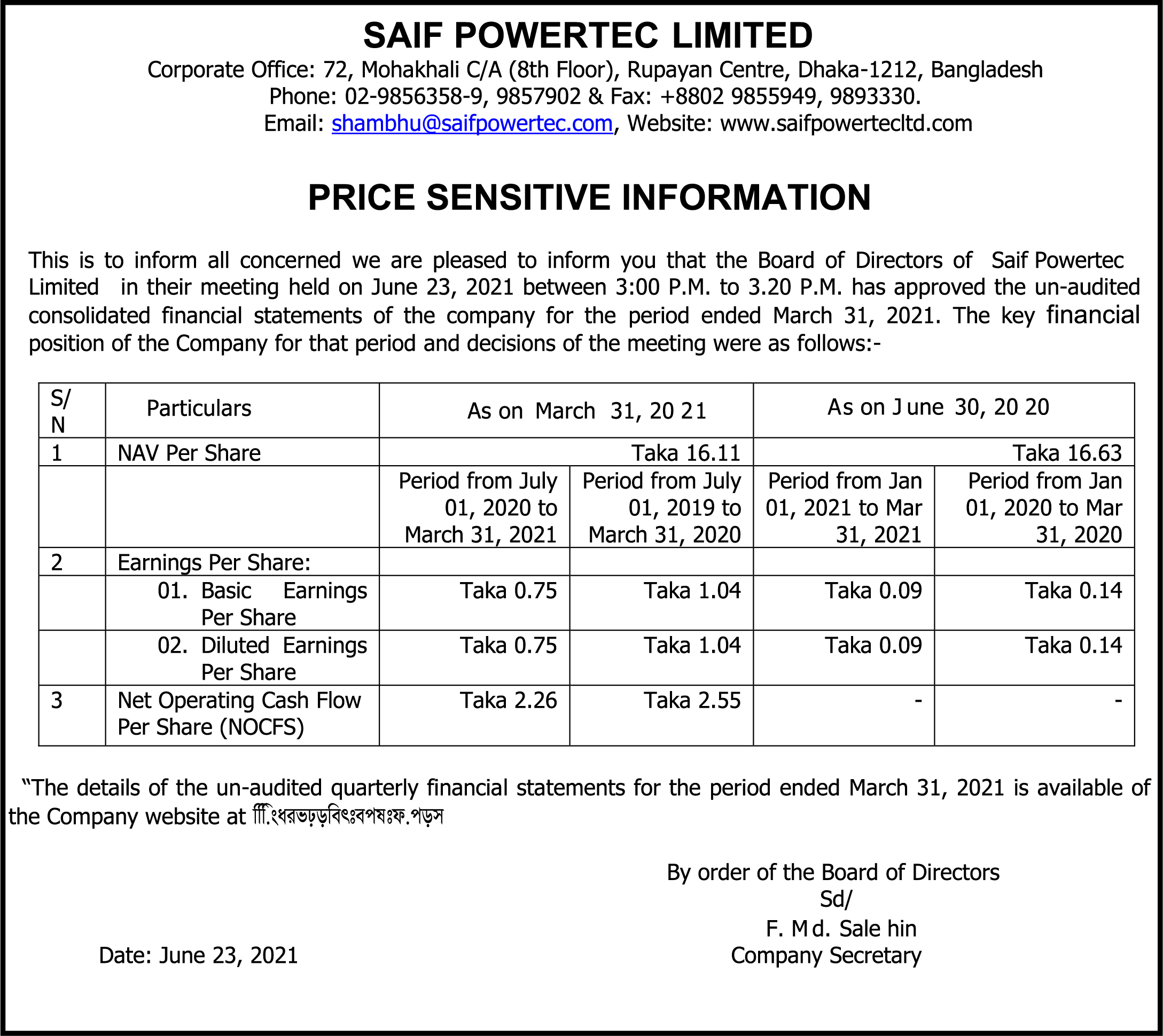 Saif Powertec Ltd- Price Sensitive Information Wednesday, 23rd June 2021, 4:44 pm Saif Powertec Ltd- Price Sensitive Information Post Views: ২,১৪০
