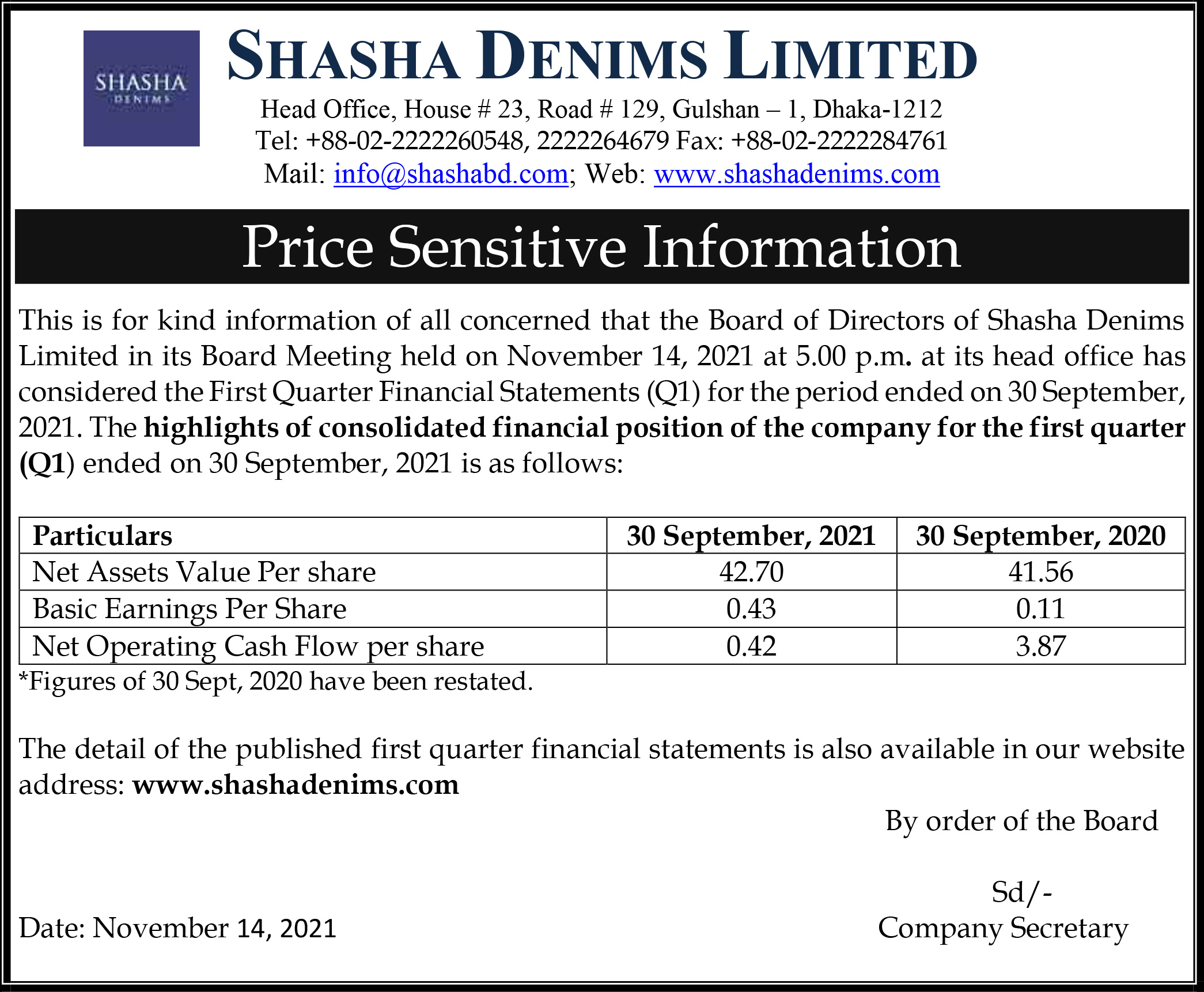 SHASHA DENIMS LIMITED-Price Sensitive Information Sunday, 14th November 2021, 8:13 pm Post Views: ১,৯৩২