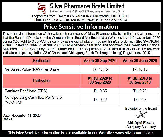 Silva Pharmaceuticals Limited – Price Sensitive Information Wednesday, 11th November 2020, 5:09 pm Silva Pharmaceuticals Limited – Price Sensitive Information Post Views: ৩,২৪৩