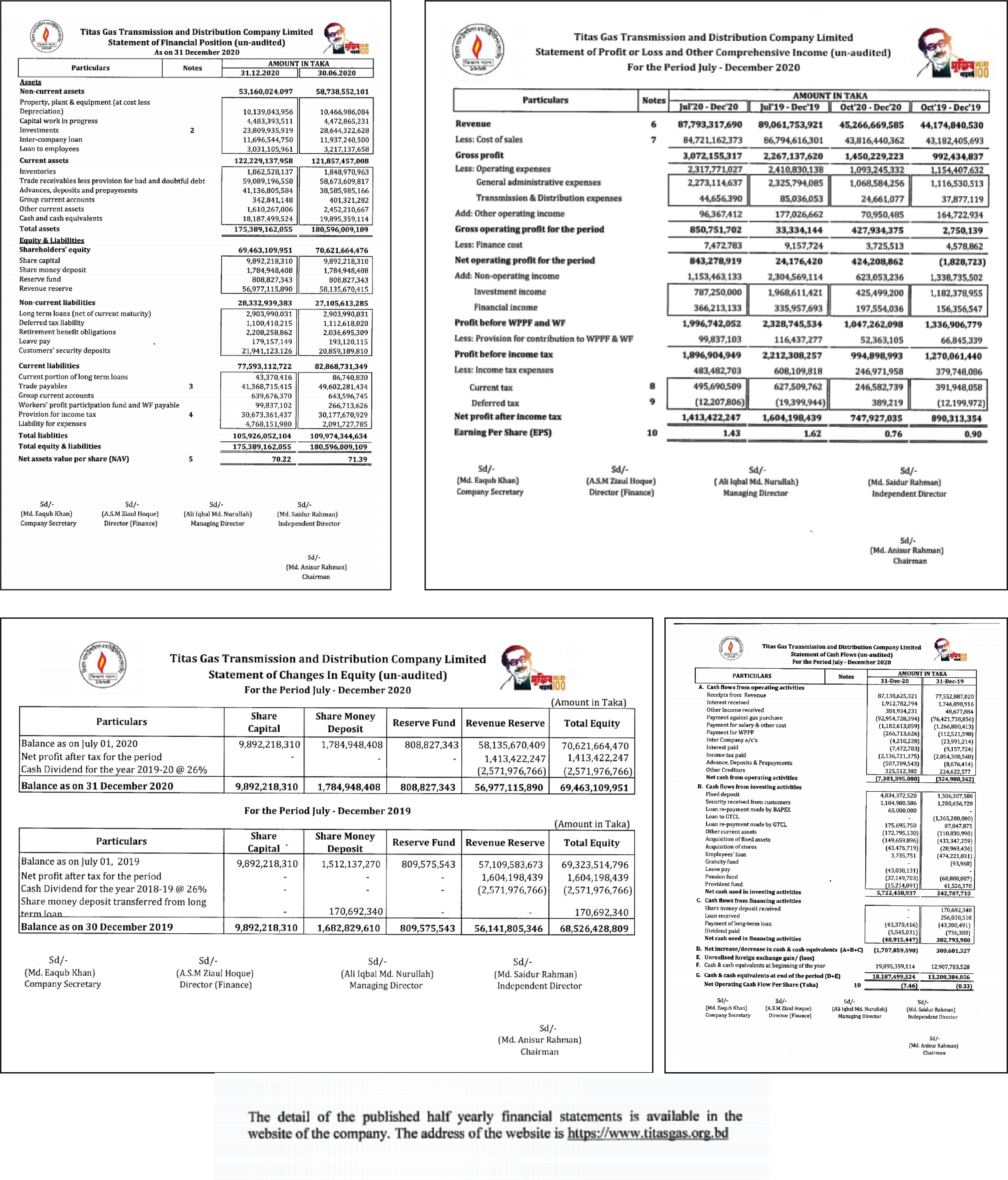 Titas Gas Tranmissions & Distributions Co.Ltd. Statement of Financial Positon (un-audited) As on 31 December 2020 Thursday, 28th January 2021, 7:32 pm Post Views: ১,৯২০