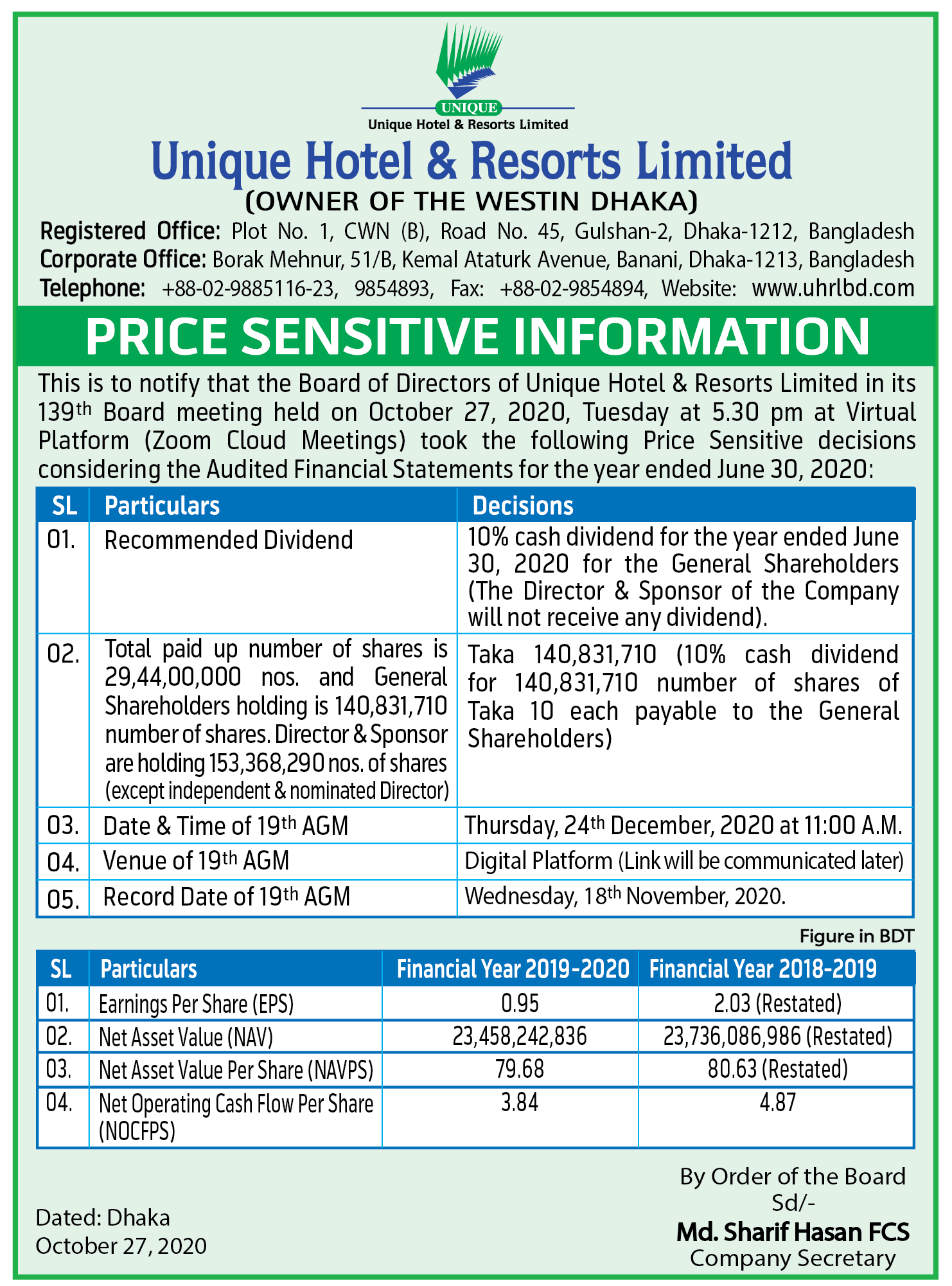 Unique Hotel & Resorts Limited- Price Sensitive Information Wednesday, 28th October 2020, 12:33 pm Unique Hotel & Resorts Limited- Price Sensitive Information Post Views: ১,২১৩