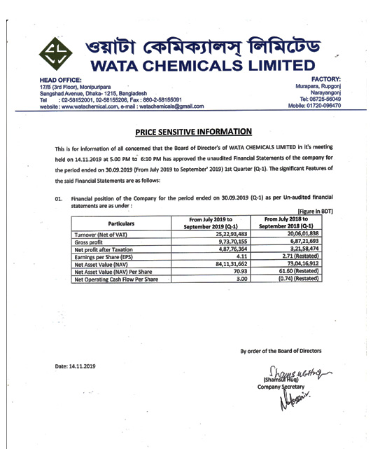 WATA CHEMICALS LTD- Q1 UNAUDITED FINANCIAL REPORT Thursday, 14th November 2019, 10:46 pm Post Views: ২,১৩৮