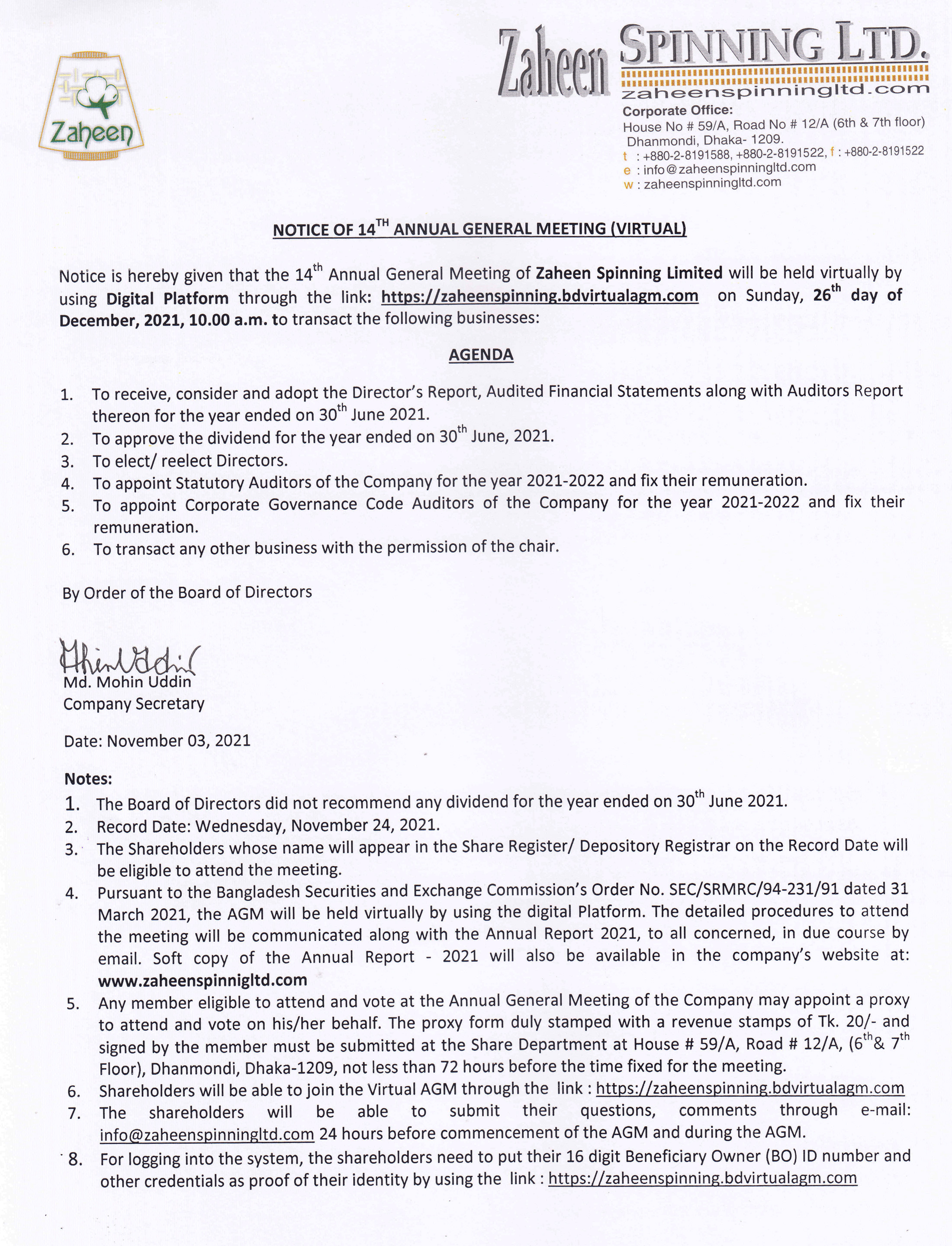 Zaheen Spinning Ltd- AGM NOTICE