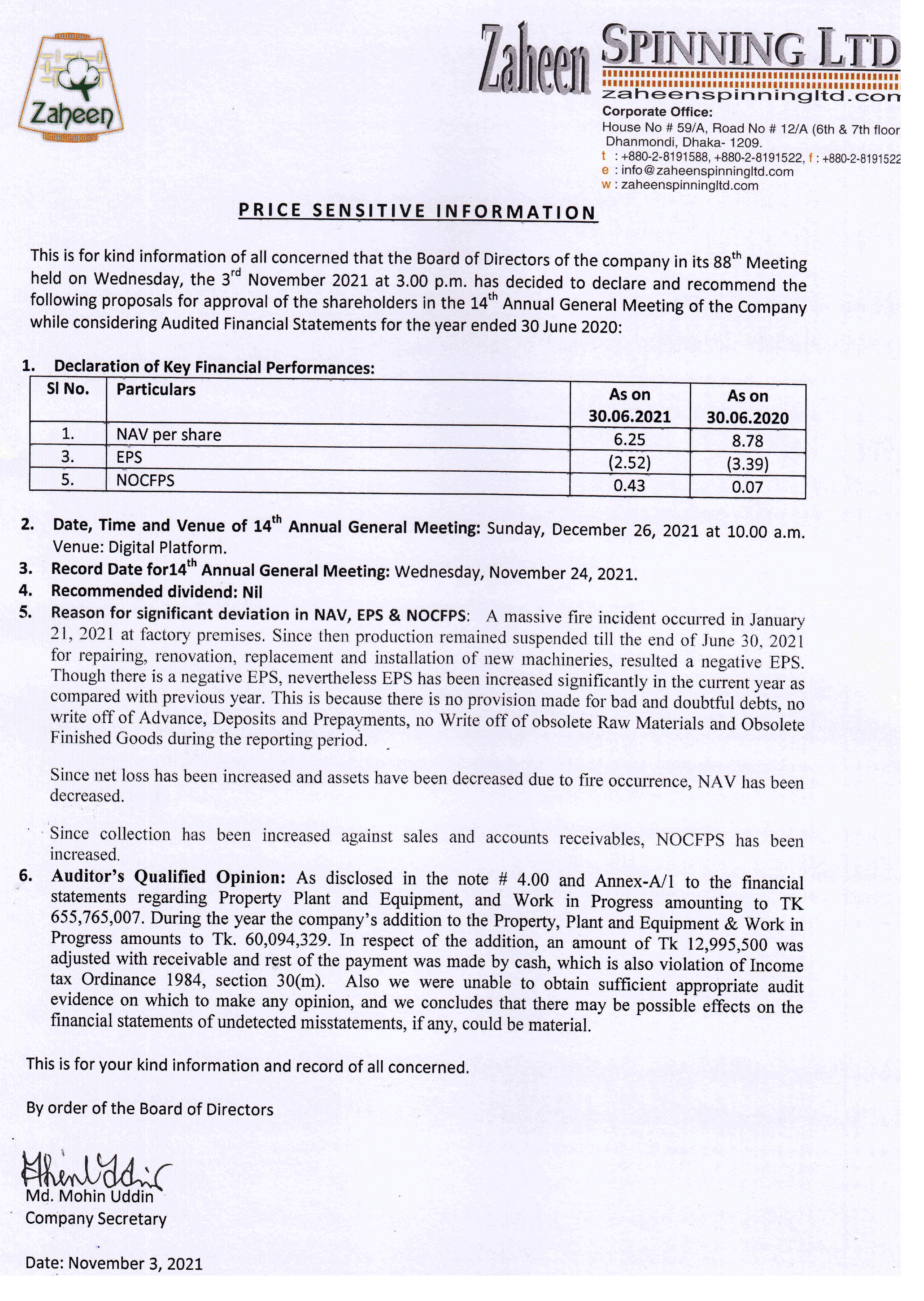 Zaheen Spinning Ltd- Price Sensitive Information Wednesday, 3rd November 2021, 7:59 pm Post Views: ১,৯৪০